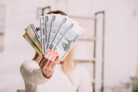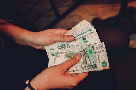 Woman holds Russian money in front of her. Close-up pack of ruble, Selective focus