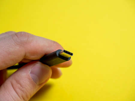 male hand usb type C cable close-up on yellow background. Copy space