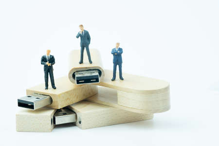 Miniature people businessman standing on wooden USB stick. Analysis or investment Blockchain concept and cyber security concept