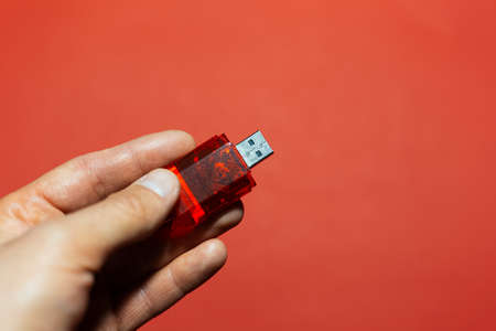 Close-up of male hand holding usb flash adapter for sd card isolated on background of red color.
