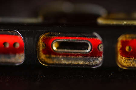 Cell phone - charging jack and speakers. Red, used phone in protective packaging. Electronics in close up.