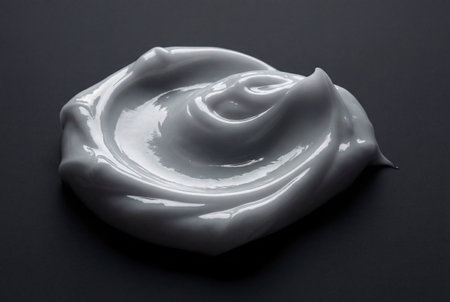 Luxurious swirl of creamy light grey cosmetic balm forming sculptural peaks and valleys on a dark surface, highlighting product texture and elegance in a studio setup