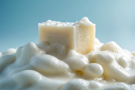 AI Generative Bar piece natural organic aromatic cosmetic handmade soap in foam on blue background