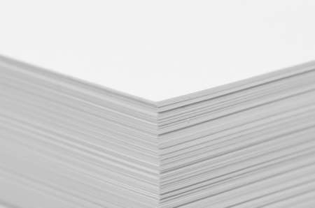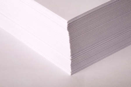 A stack of white paper is piled on a table. The paper is rectangular and has a smooth texture. The stack is quite large, with many sheets of paper visible. Concept of organization and order