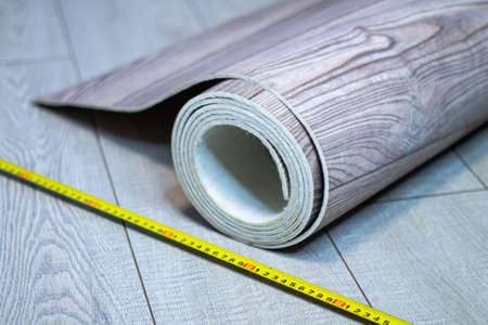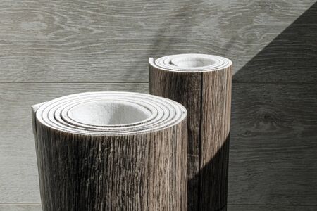 Roll of linoleum with a wood texture. Types of floor coverings. PVC.