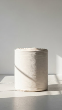 Two white paper rolls are positioned on a marble surface, with soft shadows and light emphasizing their texture and form.