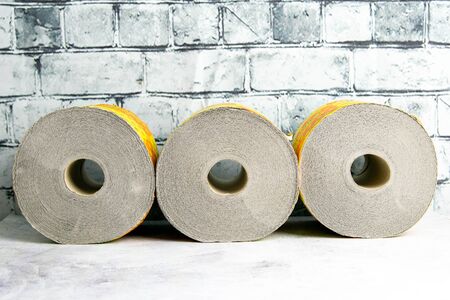 Rolls of toilet paper on table at the brick wall.
