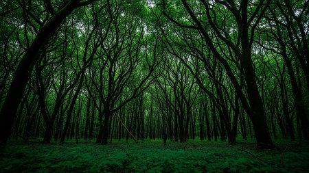 A dense green forest with tall, dark trees forming a canopy overhead and lush green undergrowth covering the forest floor.