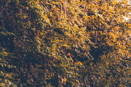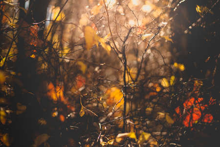 Autumn landscape view of forest with orange leaves and died tree branches around