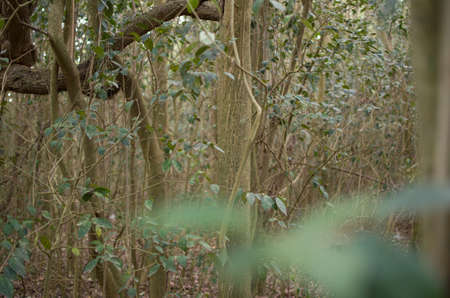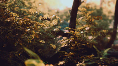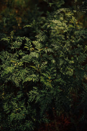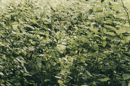 Green bushes in the forest, close-up. Dense thickets of living plants in wild. Picturesque greenery, foreground in focus. Nature background