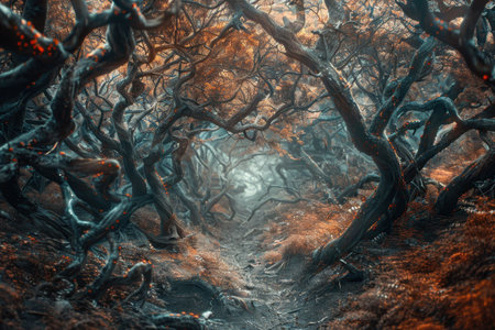 A path winds through a dense forest of gnarled, twisted tree branches, shrouded in mist.