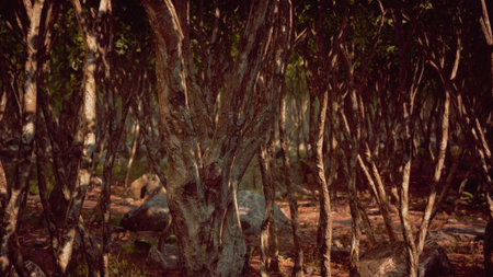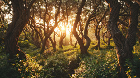 Sunlight filters through the canopy, casting soft shadows on the forest floor. Twisted trunks create a serene atmosphere, inviting exploration and wonder in nature’s embrace.