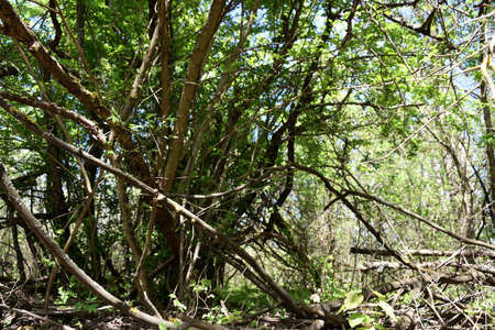 Tree branches in the forest in springtime. Nature background. Close-up.