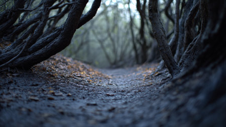 Eerie forest pathway winding through a dense grove of gnarled, dark tree roots, creating a mysterious and spooky natural tunnel experience with fallen leaves on the ground