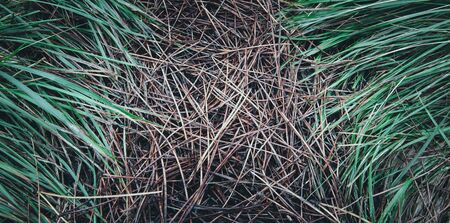 Fallen pine needles and dry leaves on the ground in the forest.Autumn Concept.