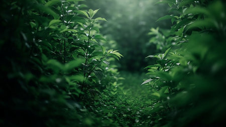 With showing dense, dark green foliage of a forest path with sunlight filtering through the leaves creating a mysterious and inviting natural tunnel effect...