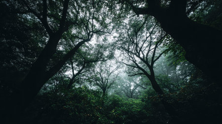 An atmospheric top down aerial view of a dense dark green forest. The moody lighting highlights the texture of the treetops creating a mysterious natural pattern.