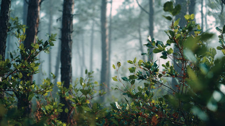 Mysterious evergreen forest in a fog at sunrise. Mighty pine and spruce trees, plants close-up. Atmospheric landscape. Nature, ecology, environmental conservation, ecotourism