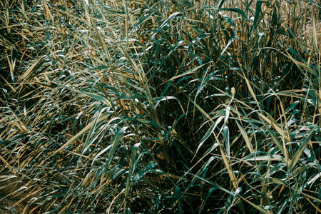 Reed texture closeup. Blurred background and reed stalks create a creative concept. There are red spots on the stems and the flowering of reeds is visible