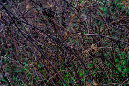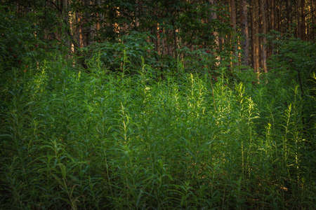 Green bushes in the forest, close-up. Dense thickets of living plants in wild. Picturesque greenery, foreground in focus. Nature background