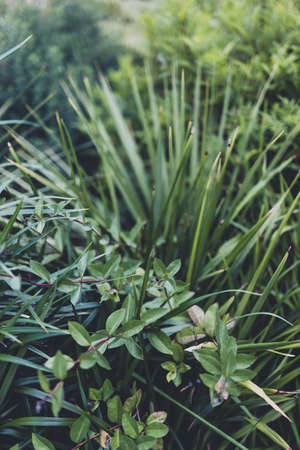 detail of lush tropical plants and grasses outdoor in sunny backyard shot at shallow depth of field