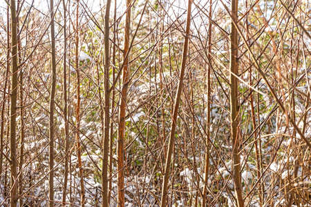 Jumble of straight grown bare young deciduous trees in winter as a background