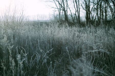 Frozen beautiful plants covered with icicles in sunlight. Winter background. Selective focus. Shallow depth of field