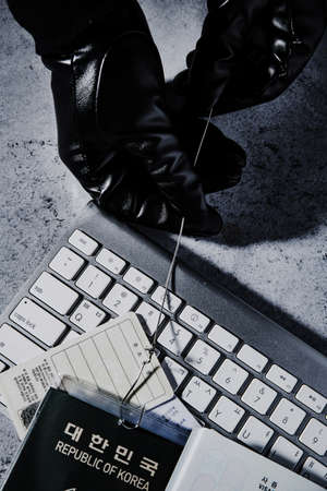 hacker hand stealing data from laptop top down