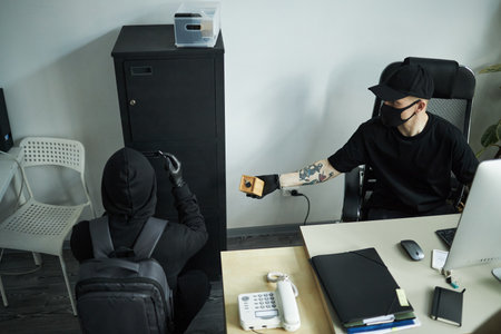Two young men, wearing black face masks and dark clothing, collaborating during burglary, one opening safe while other handing over key, during raid on company office