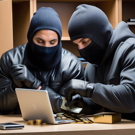 Thief in balaclava and gloves stealing money from a wallet. Criminal act of bank robbery or financial fraud concept.
