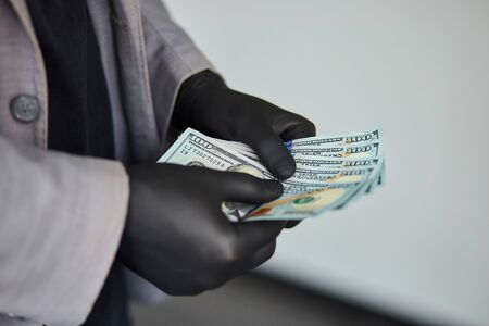 Man holding money dollars in hand in black medical gloves.