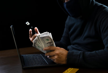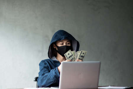 cyber crime concept, robber in black hoodie holding money and gun in hands and laptop with credit card put on table on dark background