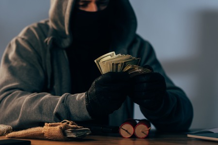 Robber in a black balaclava counting money in the basement. Gun and alcohol on the table. Crime, kidnapping, violence concept