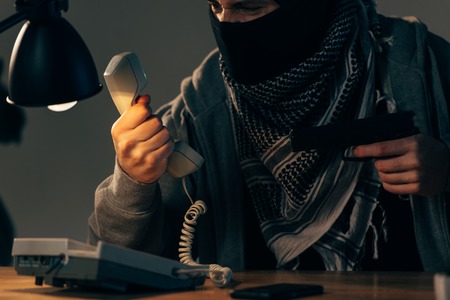 Partial view of angry criminal holding handset and aiming gun