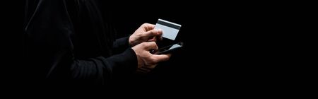 panoramic shot of hacker using smartphone and holding credit card isolated on black