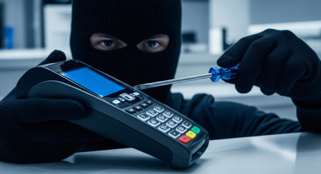 Man in balaclava removing cover from payment terminal with screwdriver. Data theft and credit card skimming device installation.