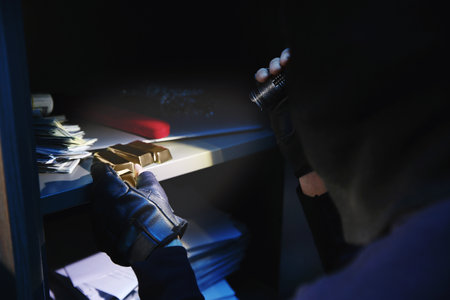Thief taking gold bars out of steel safe indoors at night, closeup
