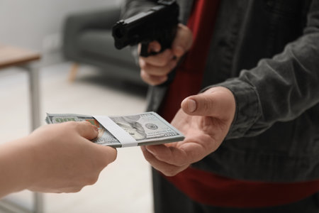 Woman giving money to criminal with gun indoors, closeup. Armed robbery
