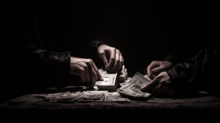 Two criminals counting stacks of us dollar bills in a dimly lit room, shrouded in shadows and secrecy, embodying greed and corruption