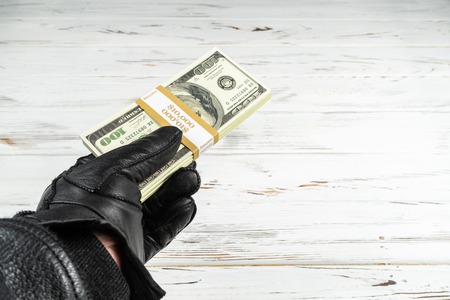 business man giving money to hand in black gloves, crime concept bribe