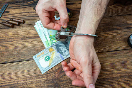 Cuffed hands of tattooed criminal suspect and plastic ziplock packet of dollar bills as evidence for investigation. Above view to old prison wooden table
