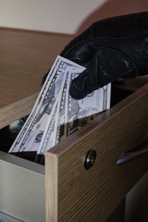 Man hand in a black glove takes money out of an office desk drawer in the night light of a flashlight