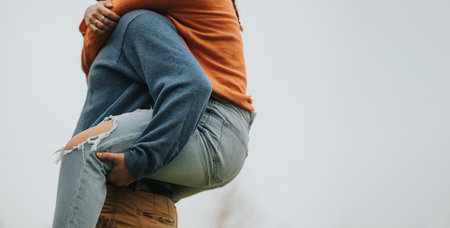 Couple joyfully embracing outdoors with casual and colorful clothing