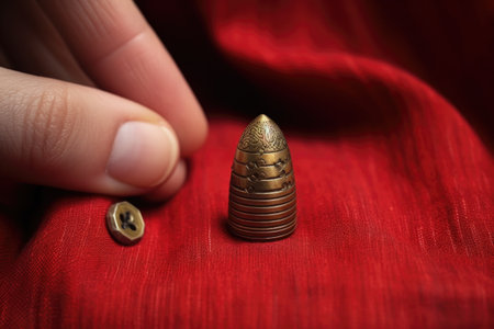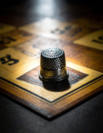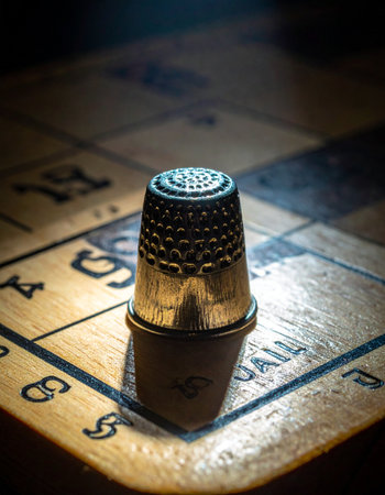 A single vintage thimble stands like a forgotten relic on a well-worn wooden game board.