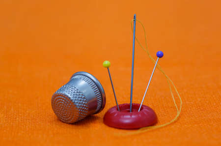 Thimble, a needle with a yellow thread and a button on an orange background. Sewing tools.