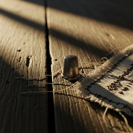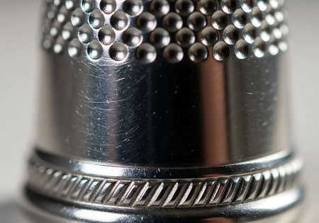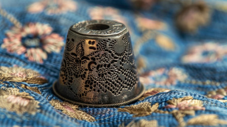 A thimble with a dainty floral pattern its surface worn smooth from years of guiding needles through tough fabric