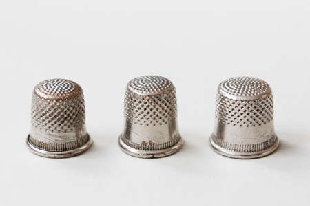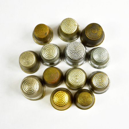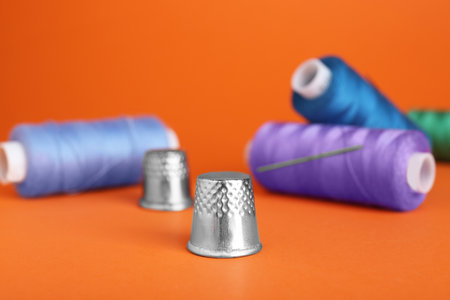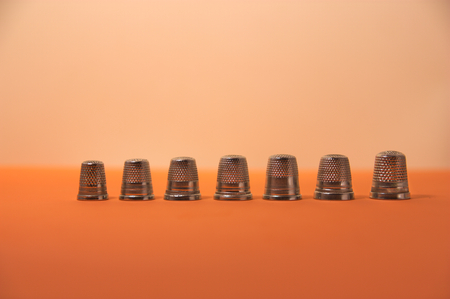 Aligned group of thimbles of different sizes on an orange surface with a blurred background