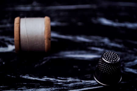Thimble and thread on a wooden background. Vintage style, selective focus.