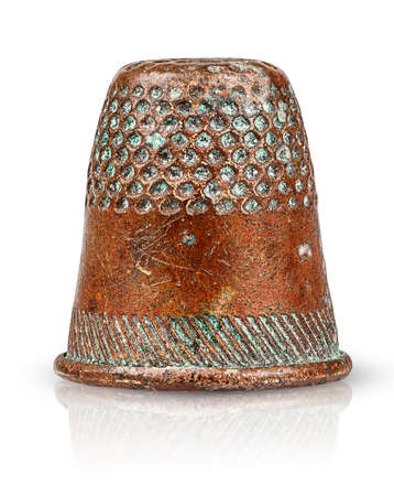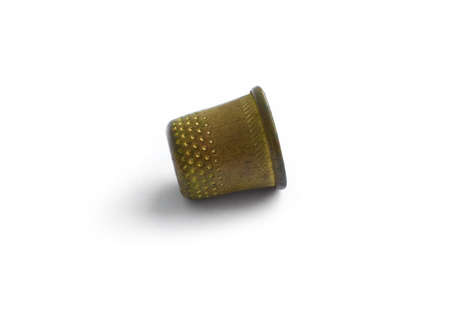 A close up of a single vintage brass timble with dramatic lighting. The sewing tool is isolated on a solid black background.