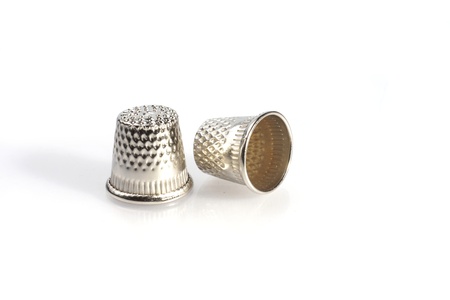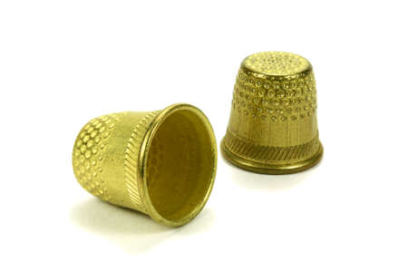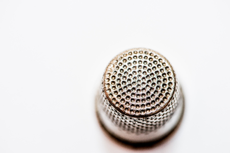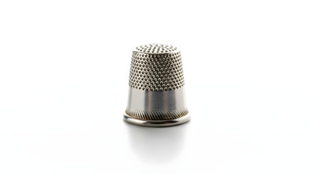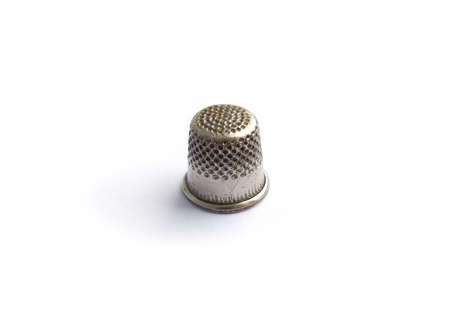 A single, metal sewing thimble with a dimpled top, isolated on a white background. The vintage-style tailor's tool is standing upright, showing its texture. This image represents sewing, tailoring, crafts, and haberdashery.